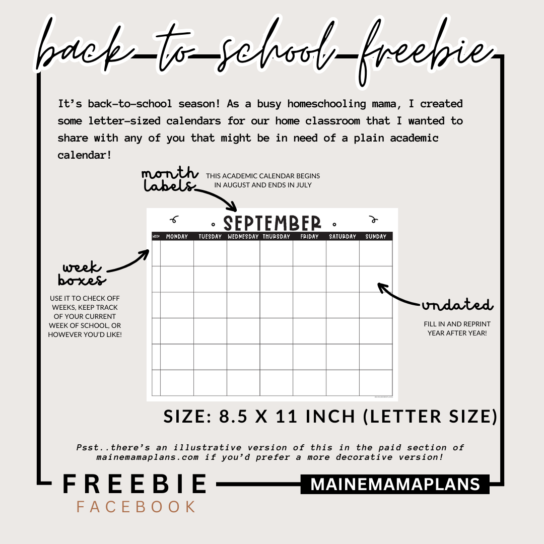 This Undated Academic Calendar (August–July) is perfect for the students in your life! I use this as a homeschool calendar to help stay on top of my kids' lessons, field trips, week of school, and activities! It is currently available in US Letter Size (more sizes coming soon).