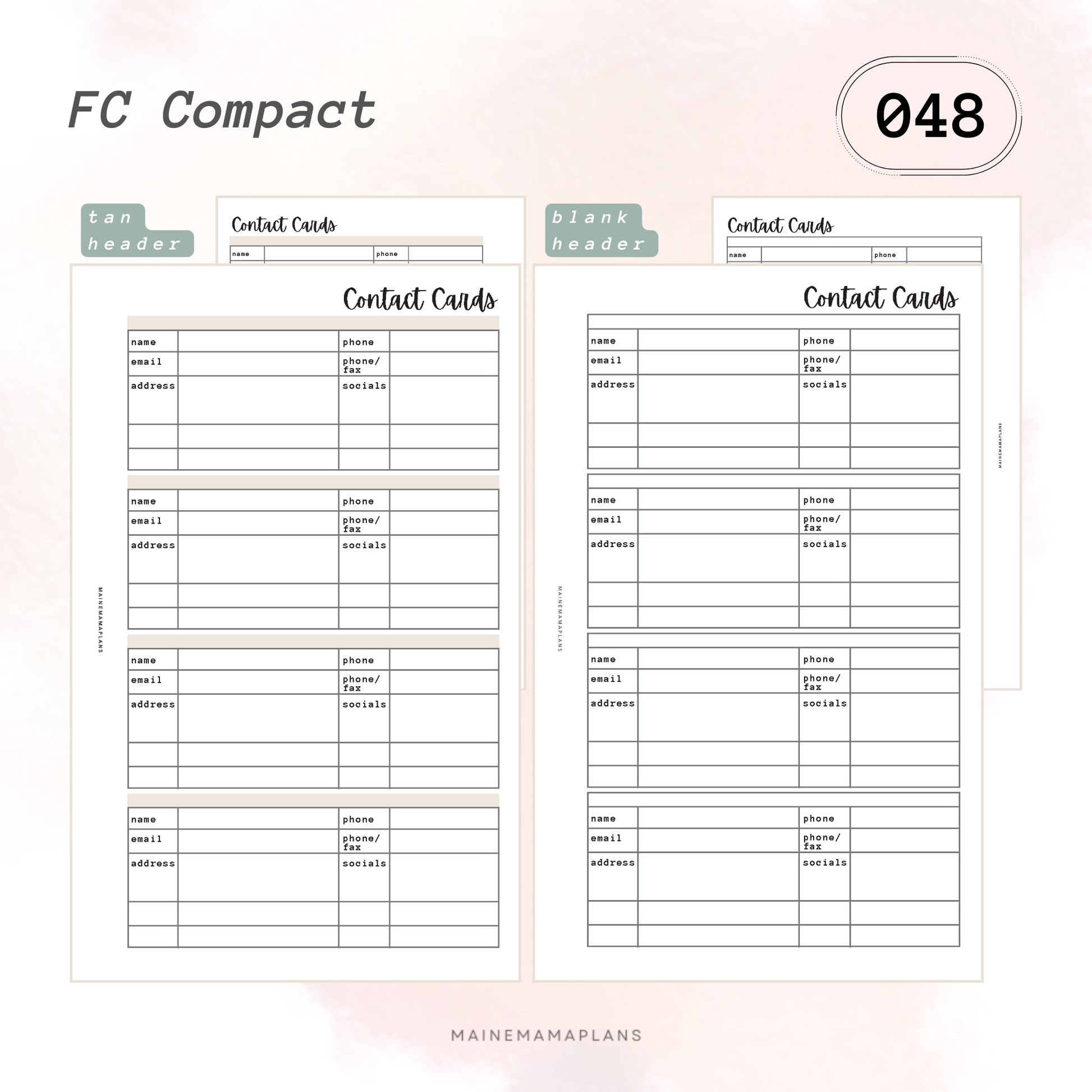 - Contact cards with both tan and blank header options with 2 blank spaces for custom fields